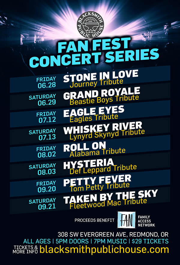 Located in the heart of Redmond, the Blacksmith Public House was established in 2022 from a converted blacksmith shop and is now a thriving food cart, tap room, coffee bar, and concert venue. The owners have created a space that benefits the community through fun, fellowship, beer, and food. Some of the featured tribute bands creating the soundtrack of Redmond’s summer include Grande Royale (Beatie Boys tribute), Eagle Eyes (Eagles tribute), Roll On (Alabama tribute), and Taken by the Sky (Fleetwood Mac tribute). Tickets can be purchased at blacksmithpublichouse.com.