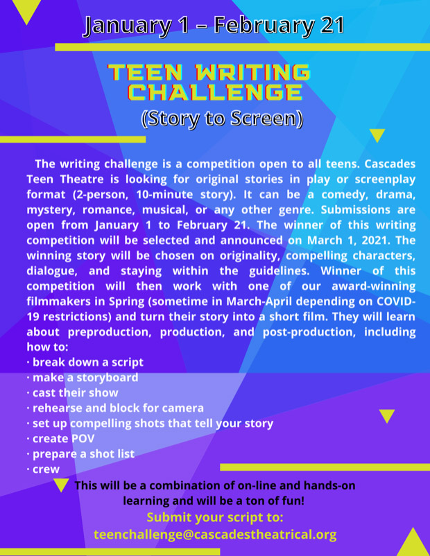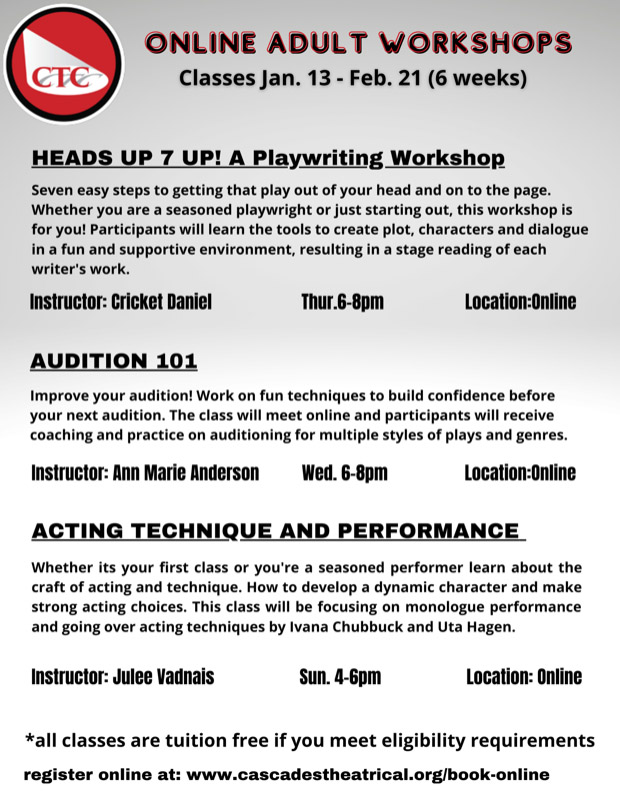 Miss the arts? We miss you. Here’s a chance to get involved from home. Cascades Theatrical Company is offering online classes and competitions for adults and teens this winter.