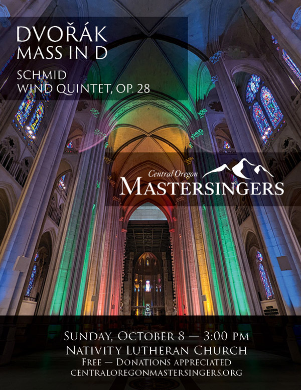 Mastersingers will share the October 8 stage with the Central Oregon Symphony’s Wind Quintet, who in addition to playing the Dvorak Mass will also be featured in Heinrich Schmid’s Wind Quintet, Op. 28.