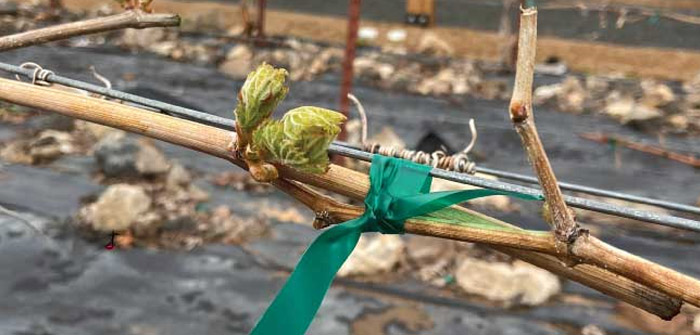 (Bud break photo taken May 6, 2023 — Pictured is one of several vitis vinifera (traditional European wine grape) varietals breaking bud at Maragas Estate Vineyard | Photo courtesy of Maragas Winery)