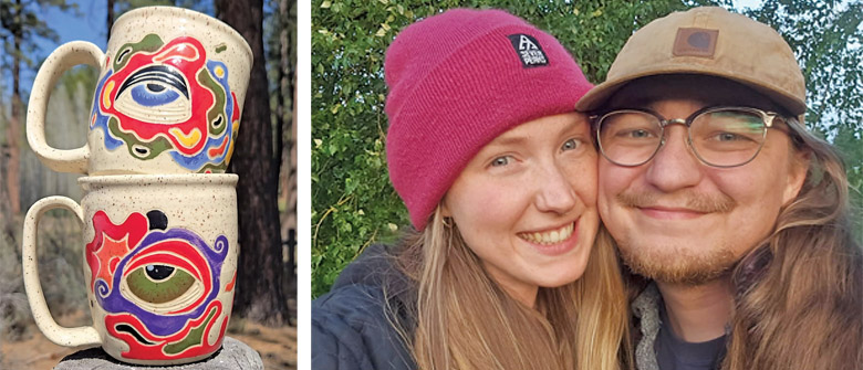 Their partnership might never have happened if they hadn’t met through the very art medium that they share today. In 2017, Alex moved from Florida to Bend and enrolled at Central Oregon Community College to get an associate’s degree. Just for fun, he took a ceramics class there and soon was hooked on pottery. He was accepted into the work-study program and, after developing proficiency in pottery, was named kiln technician and later shop supervisor, a position he still holds.