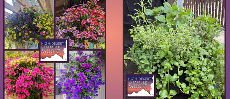 High Desert Chamber Music is offering hanging flower baskets and culinary herb baskets to fund Educational Outreach efforts. These 12″ diameter baskets will at a minimum double in size, and you can choose from a large variety of high-quality mixed flower baskets. For those who like to cook with fresh herbs, the 15” culinary baskets will consist of Lemon Balm, Oregano, Rosemary, Sage, and/or Thyme/Mint.