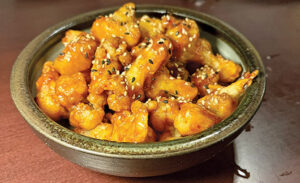 The Korean fried cauliflower, crusted in rice flour and tossed with gochujang sauce, was both mildly spicy and sweet, and utterly addictive. Ditto for the deliciously balanced kimchi and scallion pancake served with a vinegary sesame-chili sauce.