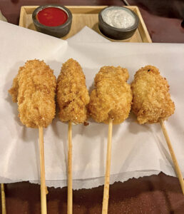 We started the evening by asking if he would be willing to indulge us with a taste of his creative whimsy, which is on full display in the 12-course chef’s tasting menu that’s available Monday through Friday with 24-hour notice. Joe presented us with two dishes — a sizzle platter with pieces of A-5 wagyu and strips of Kalbi short rib for us to sear, along with a bowl of rice and homemade soy sauce and gochujang (savory, sweet, and spicy Korean chili paste) for us to make our own fried rice. Having gone upscale, he then took us to the fair with huge Korean corndogs, a preview of the food truck they’ll be launching next year. Think wagyu wieners surrounded by gooey mozzarella, perfectly panko-crusted and fried, and served on a stick with saffron ketchup and Korean-inspired truffle ranch dressing. Amazing. And I don’t even like corndogs.