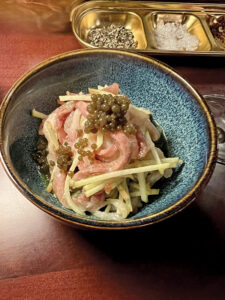 Once we turned to the regular menu, I immediately wanted to try all three raw fish ribbon starters. We all loved the delicate strips of silky yellowtail mixed with scallion-citrus pepper oil, crisp Fuji apple and nori caviar. I would happily eat that daily.