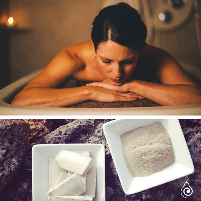 The fine volcanic pumice acts as an exfoliator that removes dead skin cells gently during the scrub. Using the absorbent and detoxifying characteristics they pull out toxins from your skin by binding to pollutants and heavy metals during the wrap.