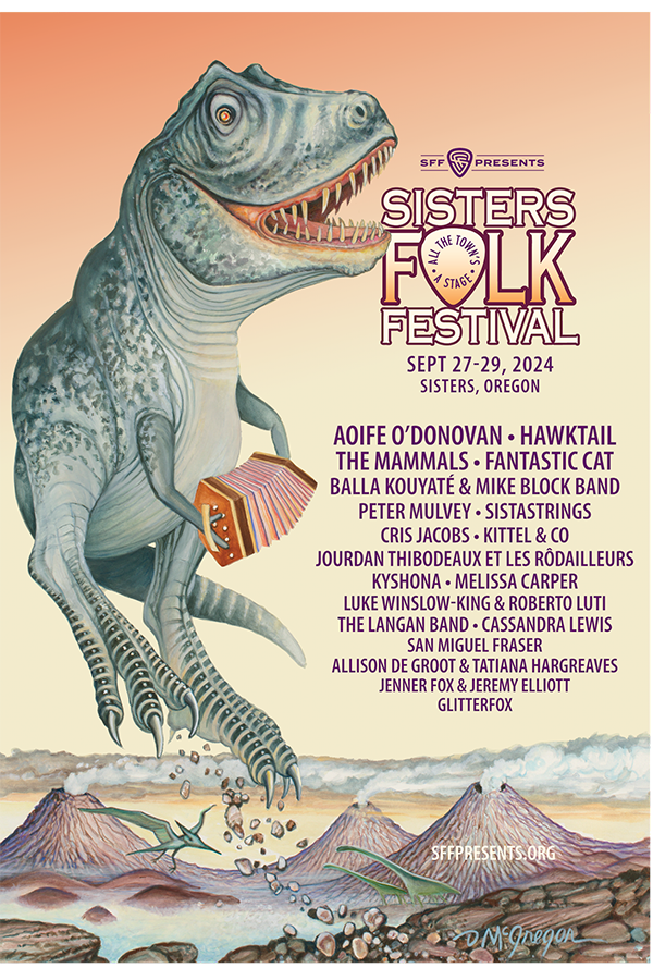 SFF Presents has announced the initial 19 artists slated to perform at the annual Sisters Folk Festival on September 27-29, 2024 in Sisters. Longtime poster artist Dennis McGregor has created another memorable image featuring Folkasaurus Rox, a jubilant Tyrannosaurus rex playing the concertina.
