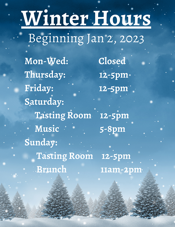 Our winter concerts are in our warm tasting room and tent. Tables and chairs provided Our sunsets are amazing and still plenty of time to share some music!