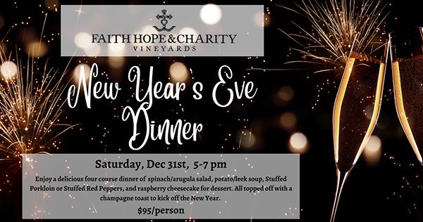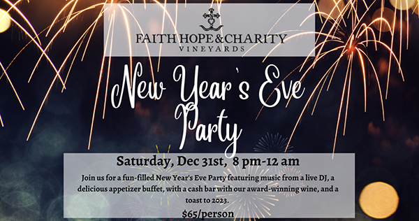New Year’s Eve Formal Dinner. Enjoy a delicious 4-course meal created by our amazing chefs, Sam and Jerry. Then after, if you are still in the mood, join us for a fun-filled New Year’s Eve Party featuring music from DJ, Casey Hurt, a delicious appetizer buffet, a cash bar with our award-winning wine, and a toast to 2023.