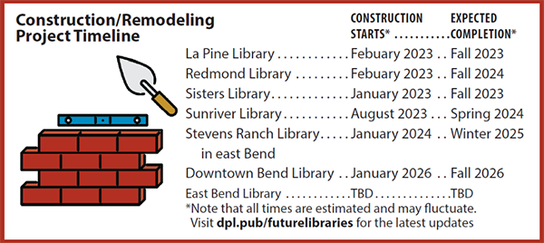 Remodeling is in full-swing at the La Pine and Sisters Libraries, with both spaces expected to reopen later this fall. A temporary library is now open on the Sisters Library property where you can pick up holds as well as do limited browsing and access computers and a printer/copier. Work is wrapping up on a temporary space for the La Pine Library; we appreciate your patience as we move closer to an opening date, which is now targeted for mid-to-late March. We’ll post an exact date as soon as we have it at dpl.pub/futurelapine. In the meantime, the next closest library is in Sunriver at 56855 Venture Lane. Customers affected by the La Pine Library closure, please disregard any overdue notices. Our team is working diligently to review items that may be overdue due to the closure. We appreciate your patience during this time.