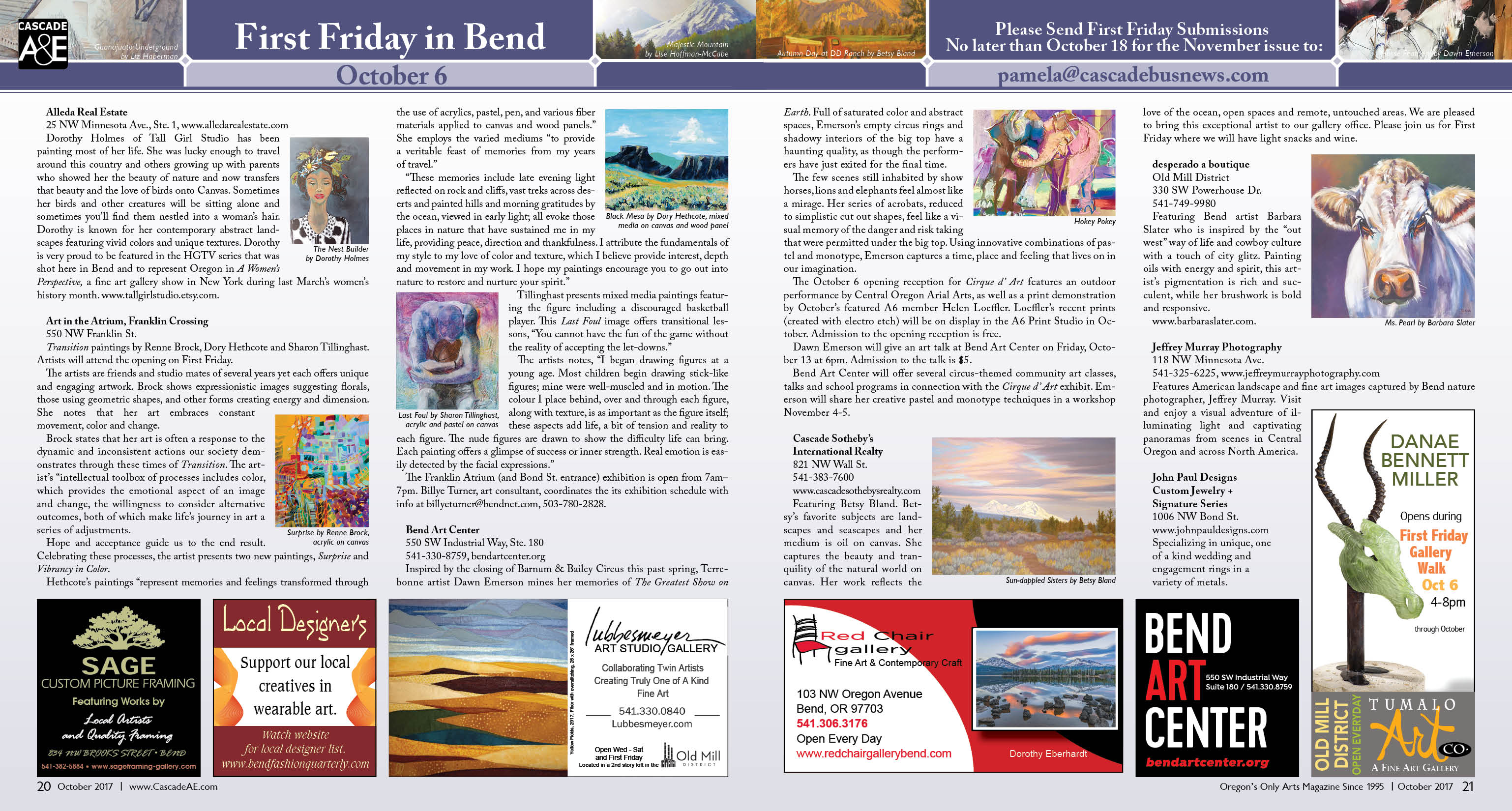 A&E Weekly 0 Winter Flirts with October First Friday in Bend By Cascade A&EOctober 3, 2017October 25, 2017 Check out our complete listing of art and artists events this Friday! (click image to zoom in)